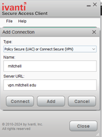 3. Name the Connection anything you like, and for the server URL put in vpn.mitchell.edu