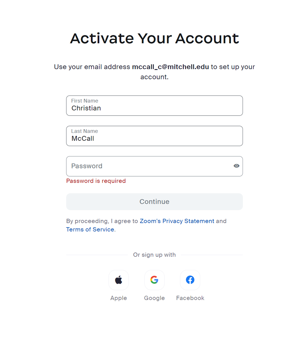 3. You will have to fill out the following Infomation. The password for this zoom account is not tied to SSO. If you forget this password there will be a password reset link on the zoom sign in page.